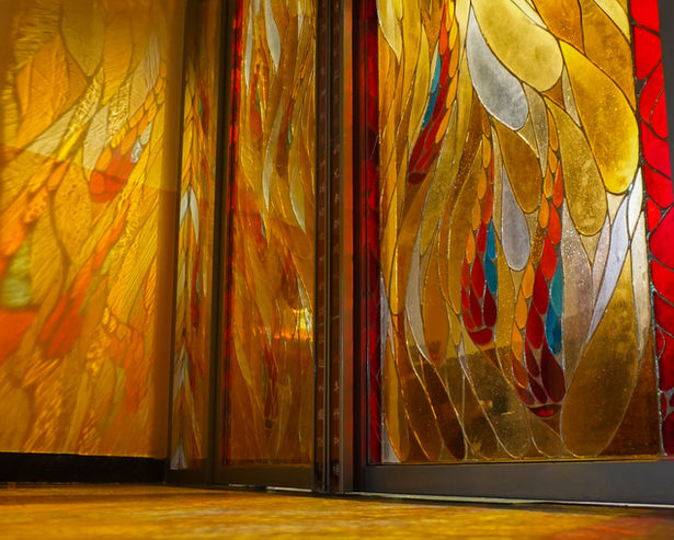 1139 "antique" glasses color this 2.80 meters wide by 2.30 meters high portal. Each piece of glass was mouth blown by Glass masters in Saint Just glassware (France) and Lamberts glassware (Glashütte) in the German city of Waldsassen.